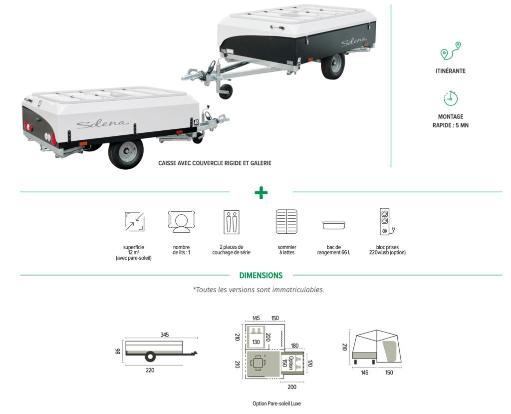 La praticité se mêle au confort avec le modèle SOLENA. Pour ceux en quête d’une caravane pliante adaptée au camping itinérant, elle représente la solution idéale. Montée en un tour de main, elle dispose d’atouts considérables. Très compacte et légère, elle convient à tout type de terrain, y compris ceux sans possibilité de piquetage. De quoi partir à l’aventure ! Conçue pour les couples ou les petites familles, la caravane SOLENA se veut confortable avec notamment son matelas confort ouaté et de larges baies rondes très lumineuses. Le couvercle est rigide en polyester renforcé et l’ouverture de caisse protégée par une serrure.